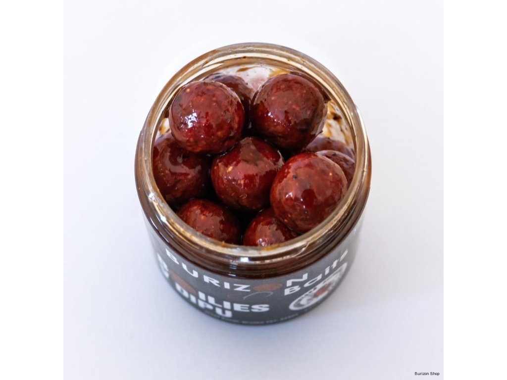 Obsahuje kvalitní rybí moučky a to včetně těch předtrávených, dále obsahuje ingredience, které odebíráme přímo od řezníka a naši know-how technikou jej upravujeme do boilies. Dále obsahuje proteiny, red robin a kvalitní zahraniční esence. Boilies na konci procesu ještě máčíme v esenci a pomalu sušíme. Esence je vtáhnutá až do samého jádra boilies, proto boilies funguje až do doby, než se rozpadně. Rozpad zpravidla bývá do 24 hodin v teplé vodě. Boilies obsahuje kvalitní konzervant. Boilies je bez umělých barviv s vysokou nutriční hodnotou, která zaručuje velmi dobrou stravitelnost u ryb.