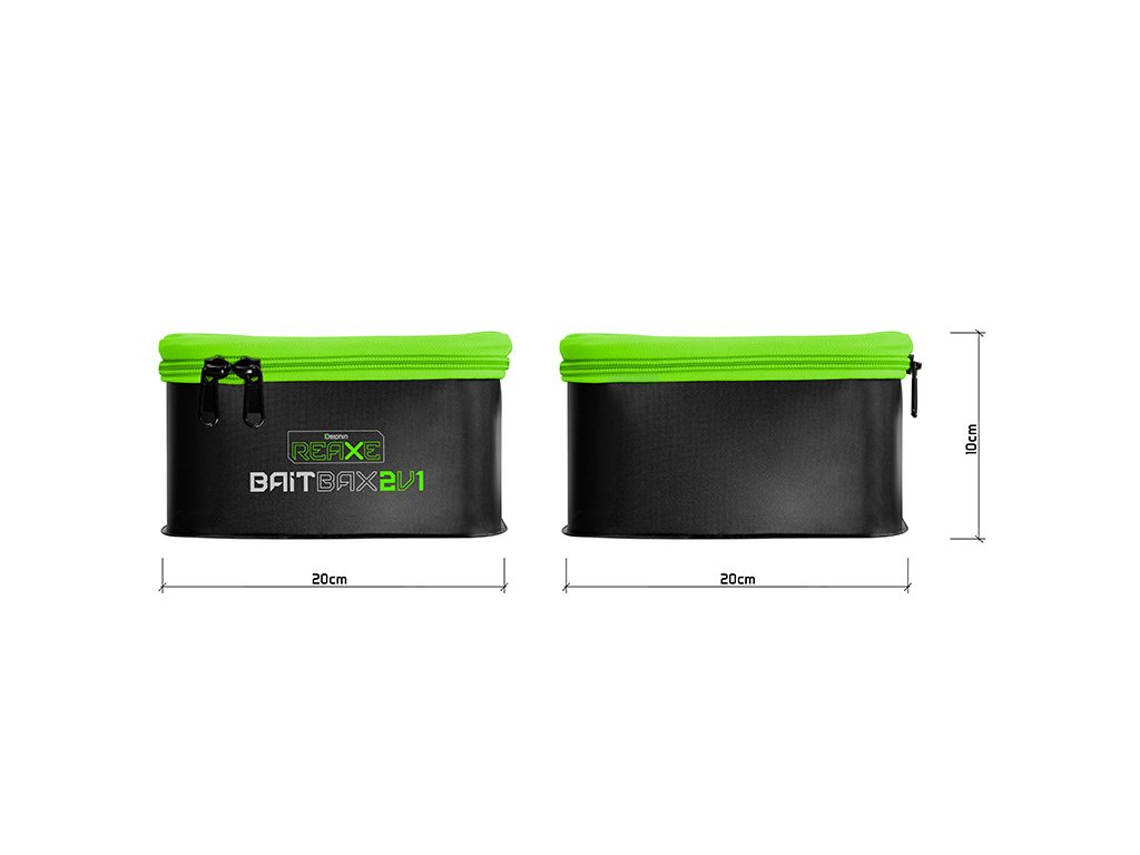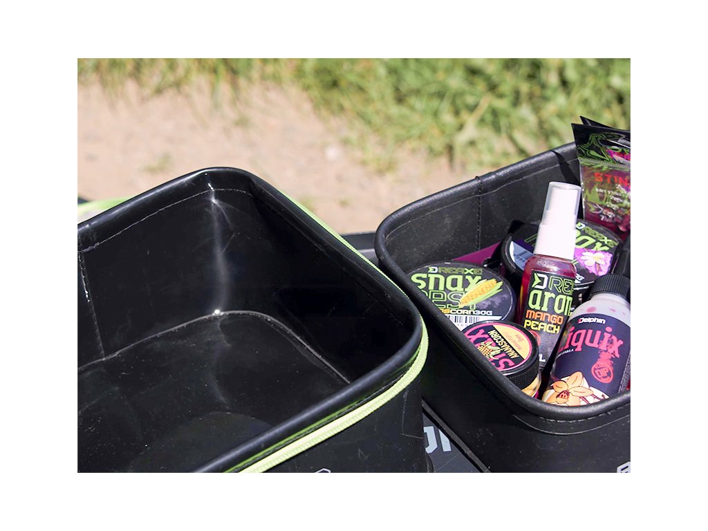 EVA set BaitBAX je černé barvy v kombinaci s výraznou zelenou grafikou, čímž excelentně ladí s jinými produkty feederové série REAXE. Taštička je opatřena kvalitním zipem, určeným pro kompletní uzavření. Jednotlivé komponenty setu do sebe skvěle zapadají, takže po ukončení vycházky je umíte do sebe lehce vložit, čímž ušetříte místo ve své výbavě.