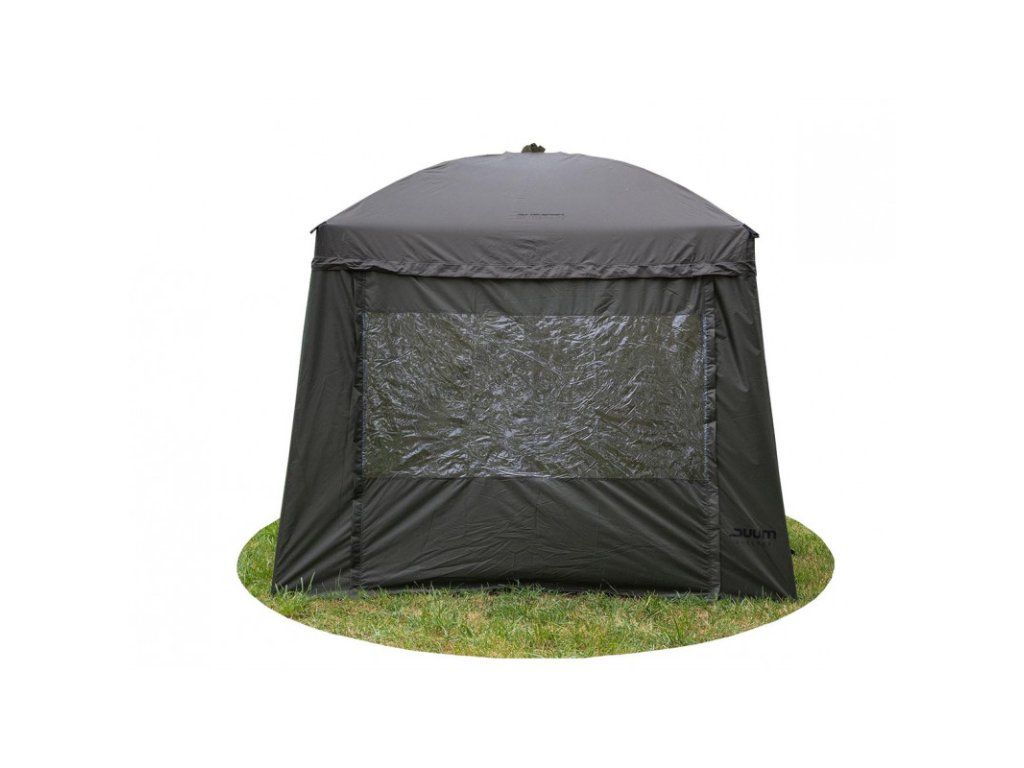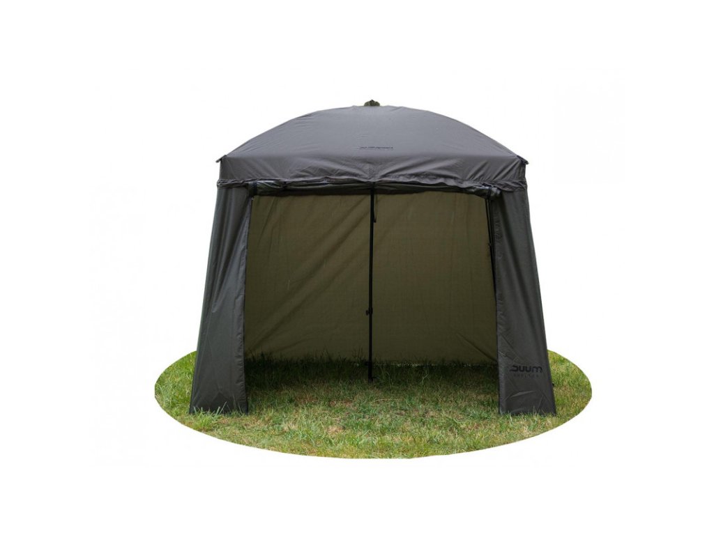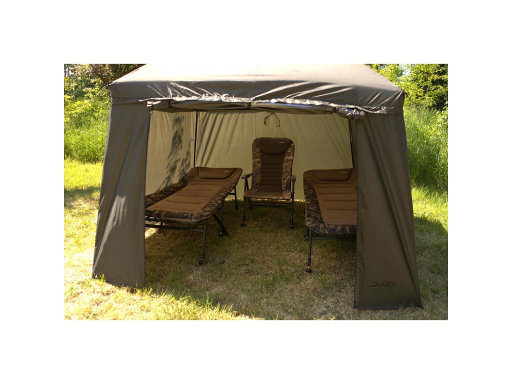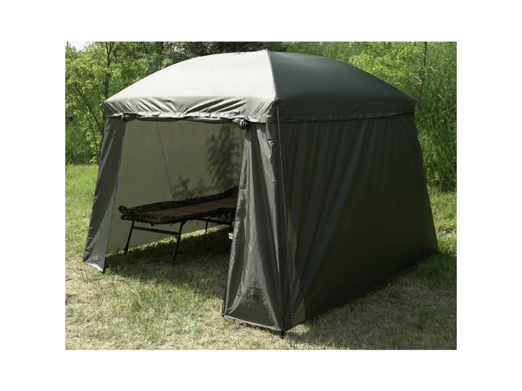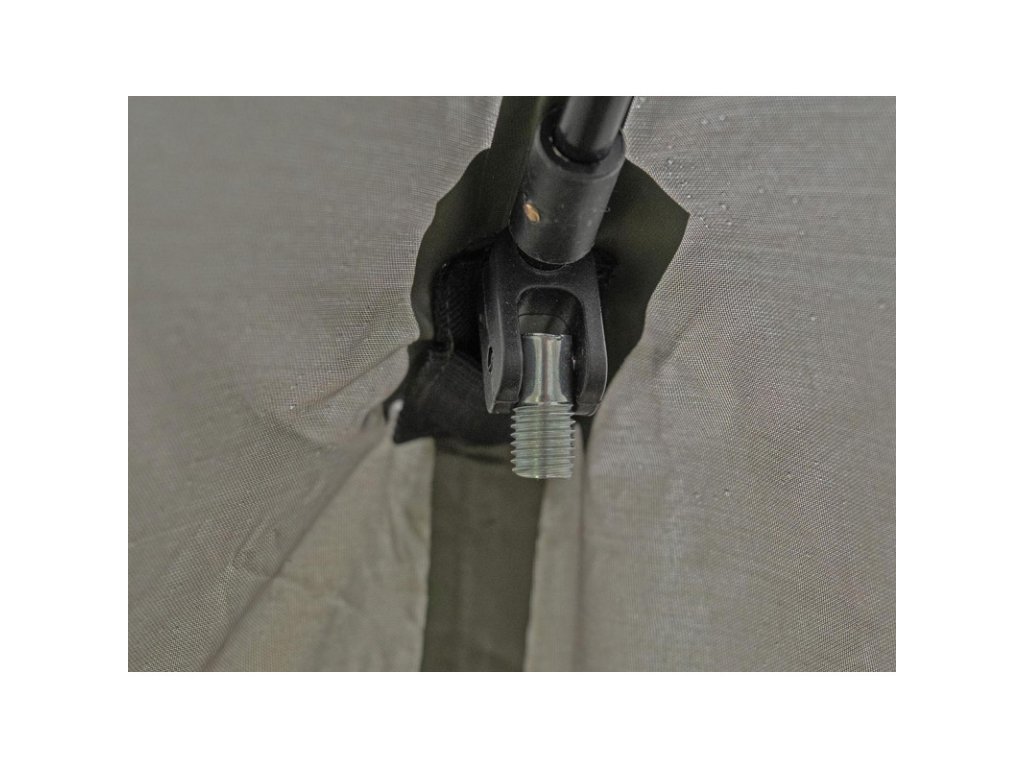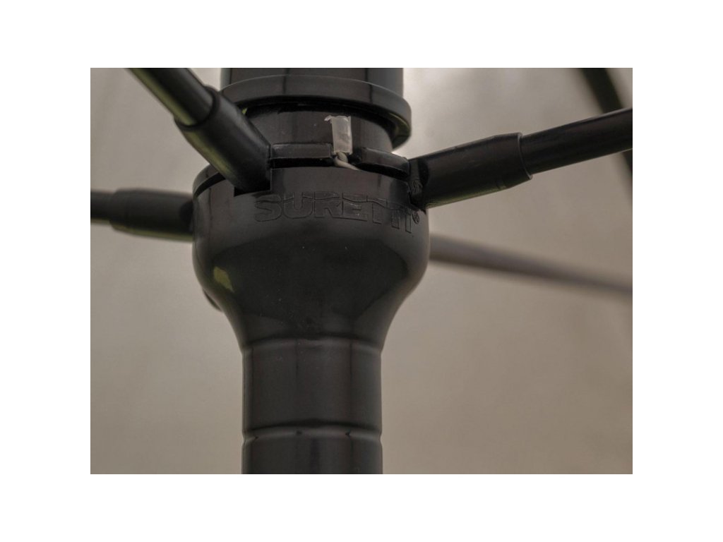 Krytý půdorys 2,5x2,5m je díky použití čtyř zesílených sklolaminátových ramen přísně čtvercový, což umožňuje stoprocentní využití vnitřního prostoru. S odlehčeným rámem se lépe manipuluje a ulehčuje stavbu celého deštníku. Kryt zipu je umístěný pod ramena. Při dešti tak voda plynule stéká, nehromadí se u švu a tím se minimalizuje možnost prosáknutí vody dovnitř. Na koncích ramen jsou už od výroby integrované klouby se závitem na teleskopické tyče. Při dokoupení čtyř tyčí lze deštník na ně postavit a odšroubovat středovou tyč. Vznikne tak uvnitř prostor pro volný pohyb.