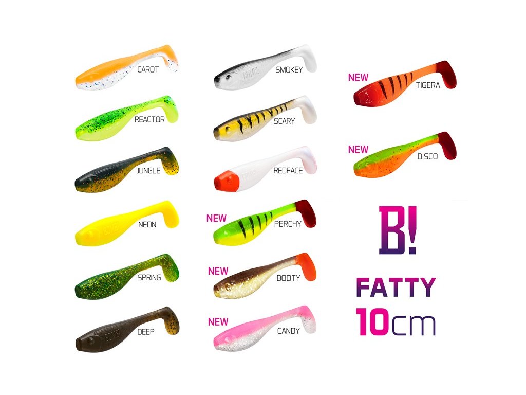 Fatty je hrdým nositelem svého jména. Tato umělá nástraha se vyznačuje tučným tělem, které je ukončeno poměrově štíhlým ocasem. Právě ten ve vodě neskutečně provokuje smysly všech číhajících dravců. BOMB! Fatty je dokonale zpracovanou nástrahou. Preciznost samotných detailů, včetně jemně strukturovaného povrchu těla je bezchybná. Díky široké nabídce těch nejúčinnějších barevných variací je Fatty tím pravým kladivem na přívlačový lov. Určitě oceníte i samotný materiál nástrahy. Ten je dokonale elastický, příjemně měkký a díky své houževnatosti i neuvěřitelně odolný a trvanlivý. To zaručuje nespočetné hodiny pravé rybářské euforie u vody!Doplňkové parametry