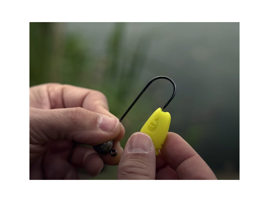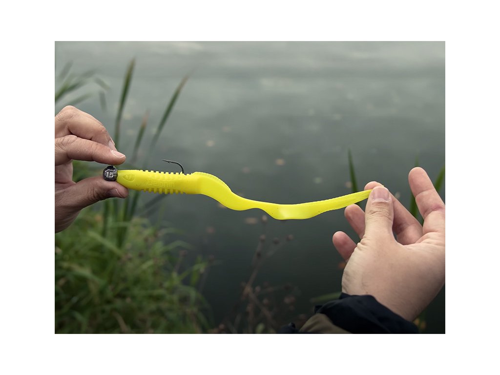 Dalším charakteristickým znakem je hlavička s vroubkováním, jejíž tvar ve vodě vytváří dodatečné vibrace a tím představuje další lákadlo pro predátory. K zajištění nástrahy je místo límečku použit drátěný držák, který spolehlivě drží nástrahu na místě a nepoškozuje ji roztahováním.