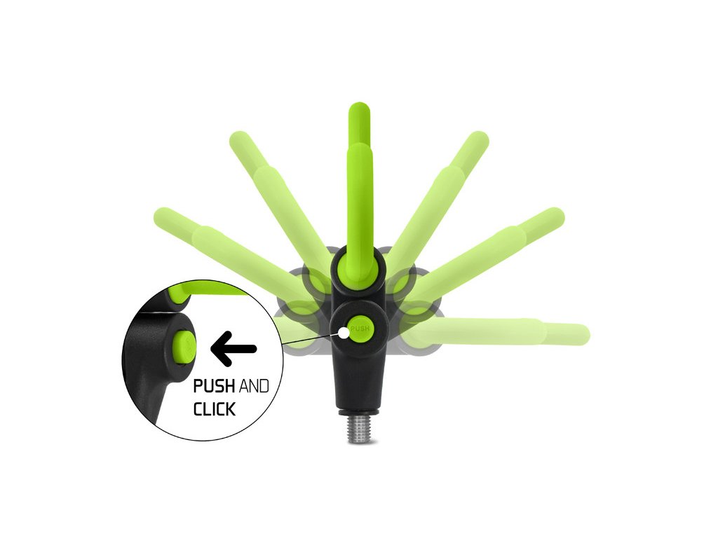 Tvar držáku umožní udržet prut ve vidličkách i při silném záběru. Díky důmyslnému systému tlačítka ve spodní části, lze tento držák polohovat a následně polohu zajistit. Šířka ramen je 17cm. Držák je osazen univerzálním závitem a je kompatibilní s většinou vidliček a stojanů dostupných na trhu. Barevná zeleno-černá kombinace dokonale doplňuje feederovou řadu REAXE.