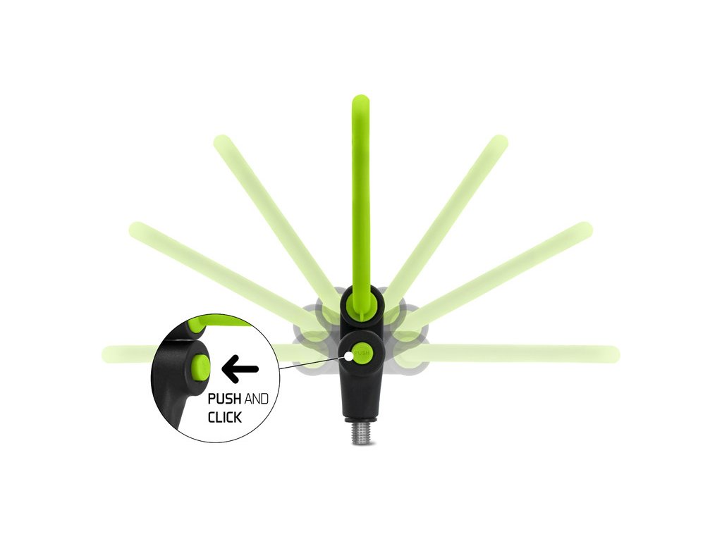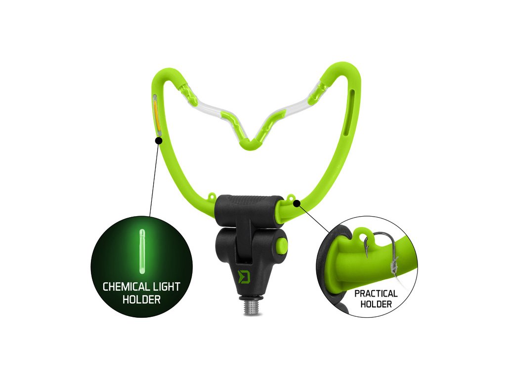 Díky důmyslnému systému tlačítka ve spodní části, lze tento držák polohovat a následně polohu zajistit. Šířka ramen je 14,5cm. Užitečným doplňkem držáku jsou očka pro uchycení háčku, do kterých můžete zachytit háček například při plnění feederového košíku. Držák má na těle umístěny 4 otvory pro chemické světlo, což oceníte zejména při nočním rybolovu. Držák je osazen univerzálním závitem a je kompatibilní s většinou vidliček a stojanů dostupných na trhu. Barevná zeleno-černá kombinace dokonale doplňuje feederovou řadu REAXE.