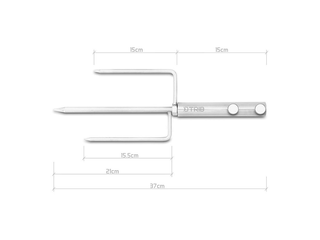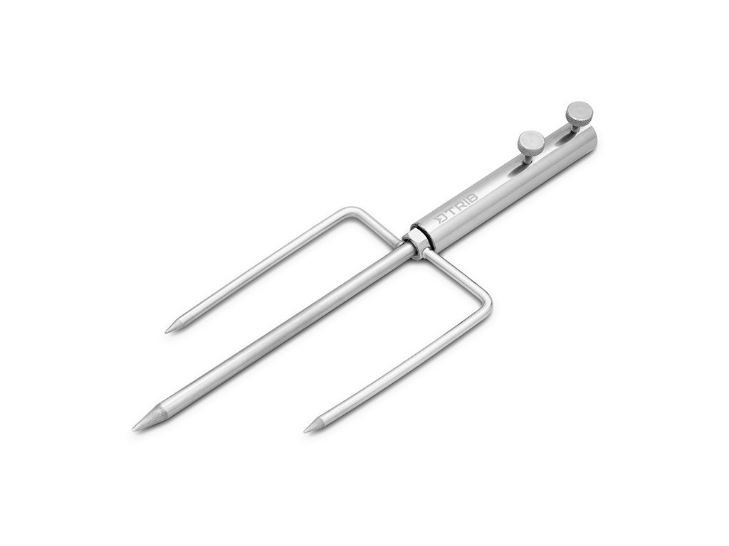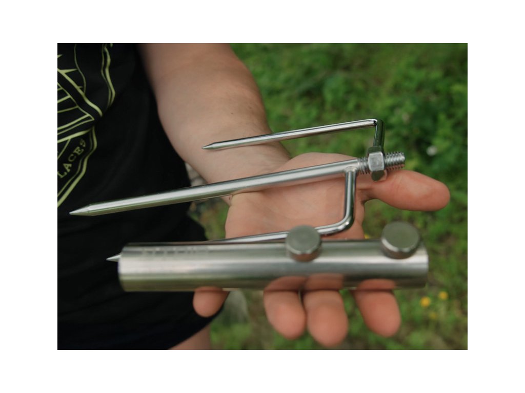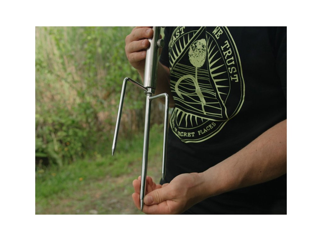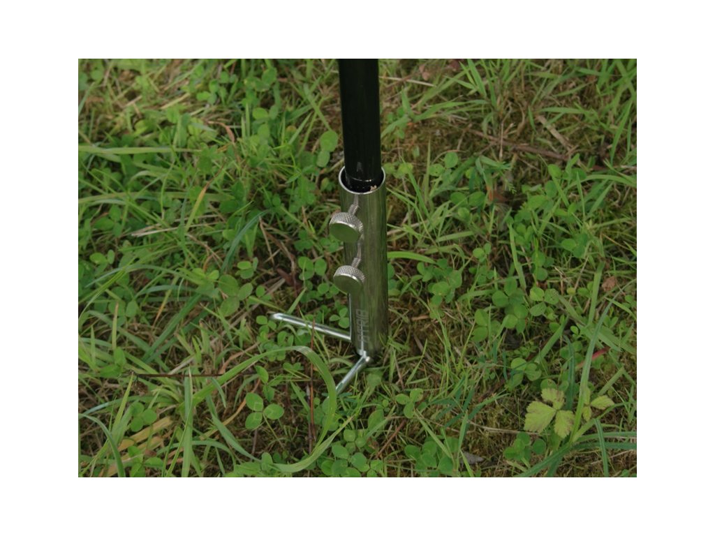O dokonalou stabilitu se starají tři hroty, jejichž tvar vytváří praktickou plochu pro zatlačení chodidlem – díky ní držák jednoduše zapíchnete i do tvrdého podkladu. Jeden z hrotů je vybaven maticí, což umožňuje nastavení jeho polohy, ale také úplné odnímání. Počet a polohu hrotů lze tedy nastavit podle potřeby, pro co nejpreciznější zafixování držáku v zemi.